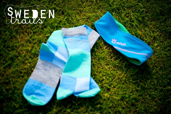 RÖJK har en hel del strumpor eller ”footgloves” som de kallar dem. Mina heter Superliner Findus och är färgglada samt gjorda i 68% mulesingfri merinoull, 22% polyamid och 10% lycra. Strumporna är tunna med lite förstärkningar på utsatta ställen. Det finns inget höger eller vänster och de är sydda med tunna sömmar. Jag har redan sprungit i dessa en hel del och kan tillägga att för mig fungerar de ypperligt. Pannbandet heter Reverse Headband och är sydd i Tvister Fabrick. 23 gram och one-size funkar på mig. Viker jag den dubbel har jag ett klassiskt svettband a la Björn Borg.