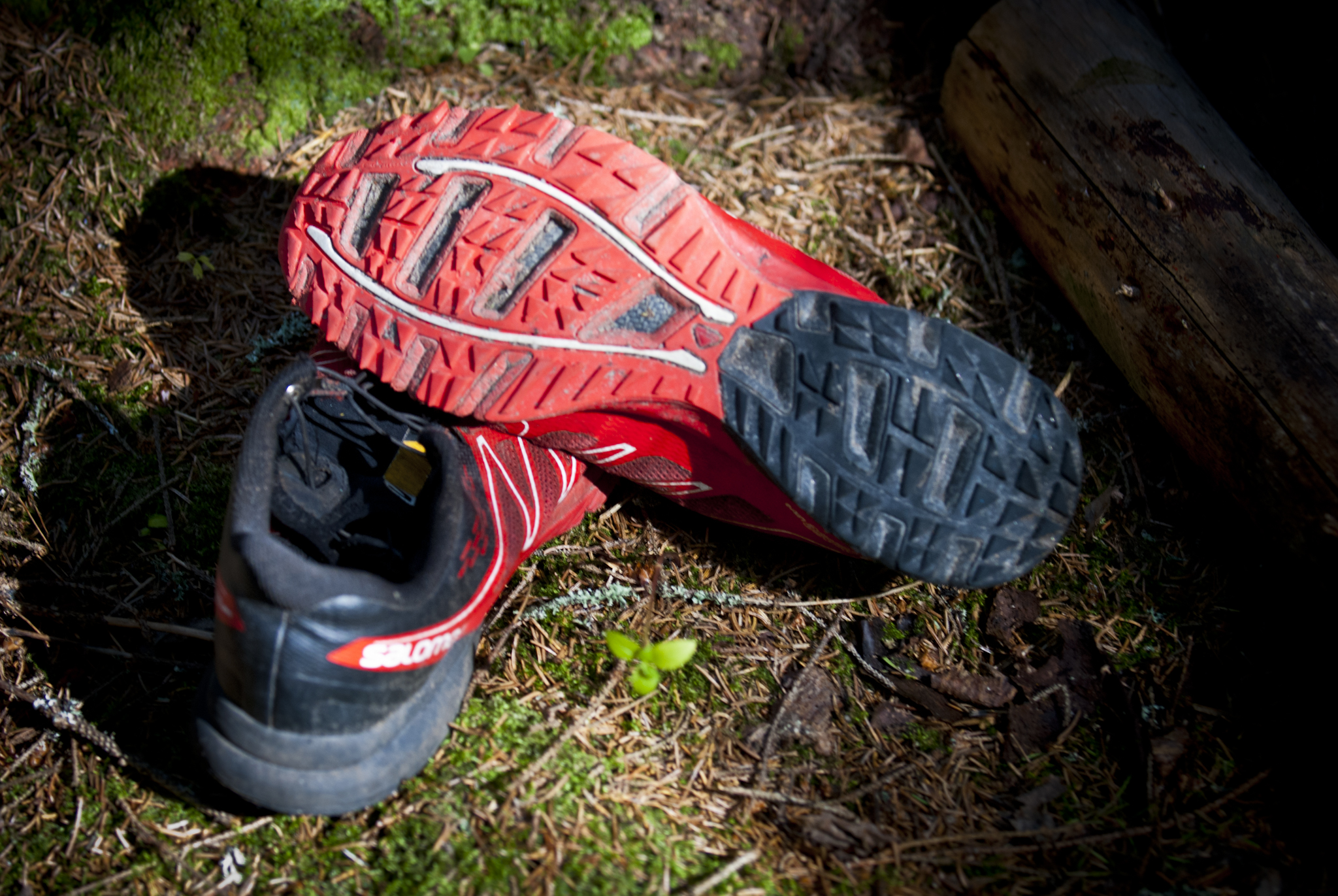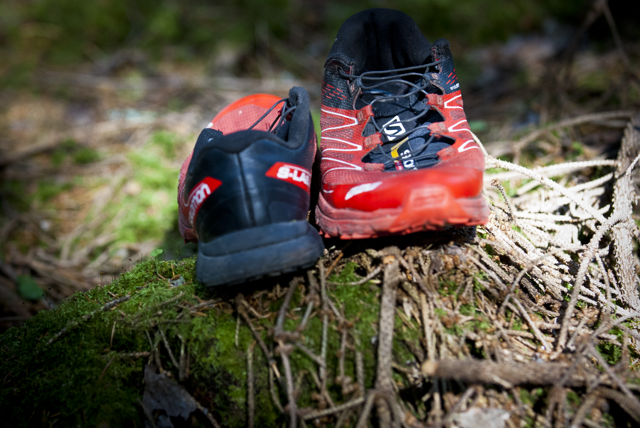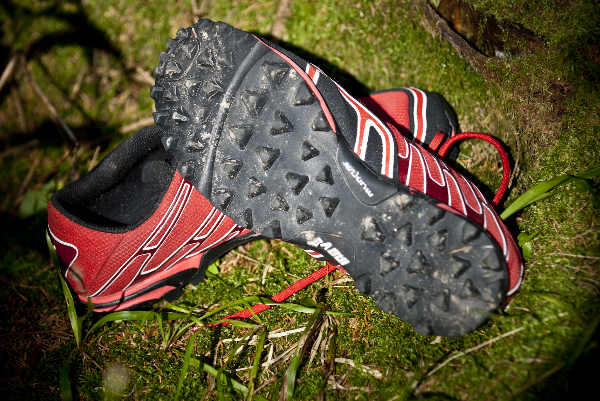 Sulan är då den berömda supergreppande Mudclaw i svart ”sticky-rubber”. Greppet i lera är riktigt bra, det bästa jag testat. Det spelar ingen roll om det går upp, ned eller i sidled, Mudclaw levererar. På blöt sten är den bra utan att vara fantastisk. Jag upplever X-talon som lite bättre. Blöta rötter och trästockar är också ett problem. Eftersom dubbarna är relativt många så har de svårt att greppa kring rötterna. Den är fortfarande bättre än de flesta liknande terrängskor dock. Vill man ha riktigt grepp på trä så är det bara metalldubb som gäller. De många dubbarna gör istället att skon är förvånansvärt skön på platt underlag. Jag har inga som helst problem att springa sträckor med asfalt i den. Lerränsningen OK, mer kan man inte räkna med när man springer med så mycket dubb. Skon känns riktigt låg och markkontakten är riktigt bra. Ändå är det precis så mycket dämpning att jag törs dra på i steniga utförslöpor.
