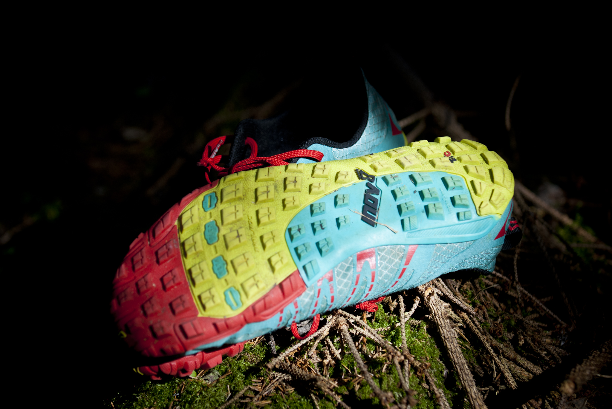 Skon har också begåvats med den nya 3mm mellansulan. Jag är väldigt förtjust i den. Lagom hård, bra respons och förvånansvärt bra dämpning även för längre sträckor. Dessutom gör ju dubbarna i en sån här sko sitt när det gäller dämpningen. Skon har Inov-8s äldsta rock-plate kallad Meta-shank gen1, den skyddar inte lika mycket som gen3 men den ska ju gå där det är mjukt. Passformen i denna sko är den så kallade ”precision-fit”. Den är lite smalare och ger foten mer stabilitet än de andra passformerna. Det passar mig men ger vissa fötter en klaustrofobisk känsla. Jag tycker dock att Mudclaw känns lite rymligare i sidled än vad övriga ”precision-fit” modeller känns.