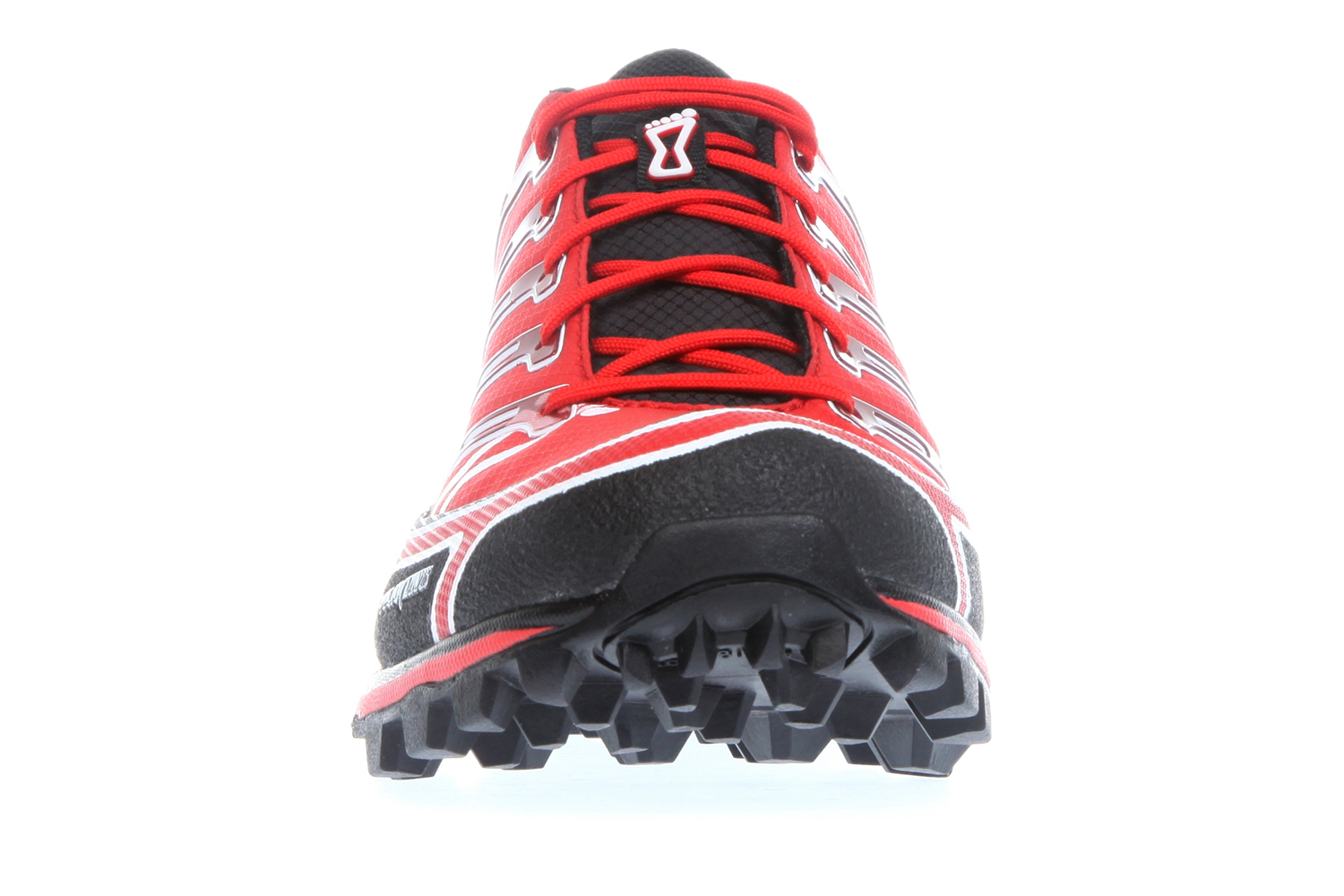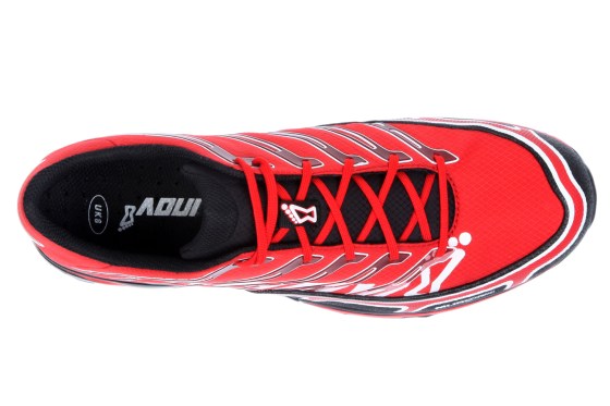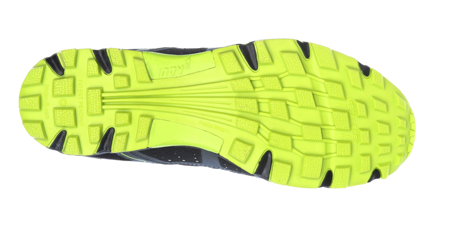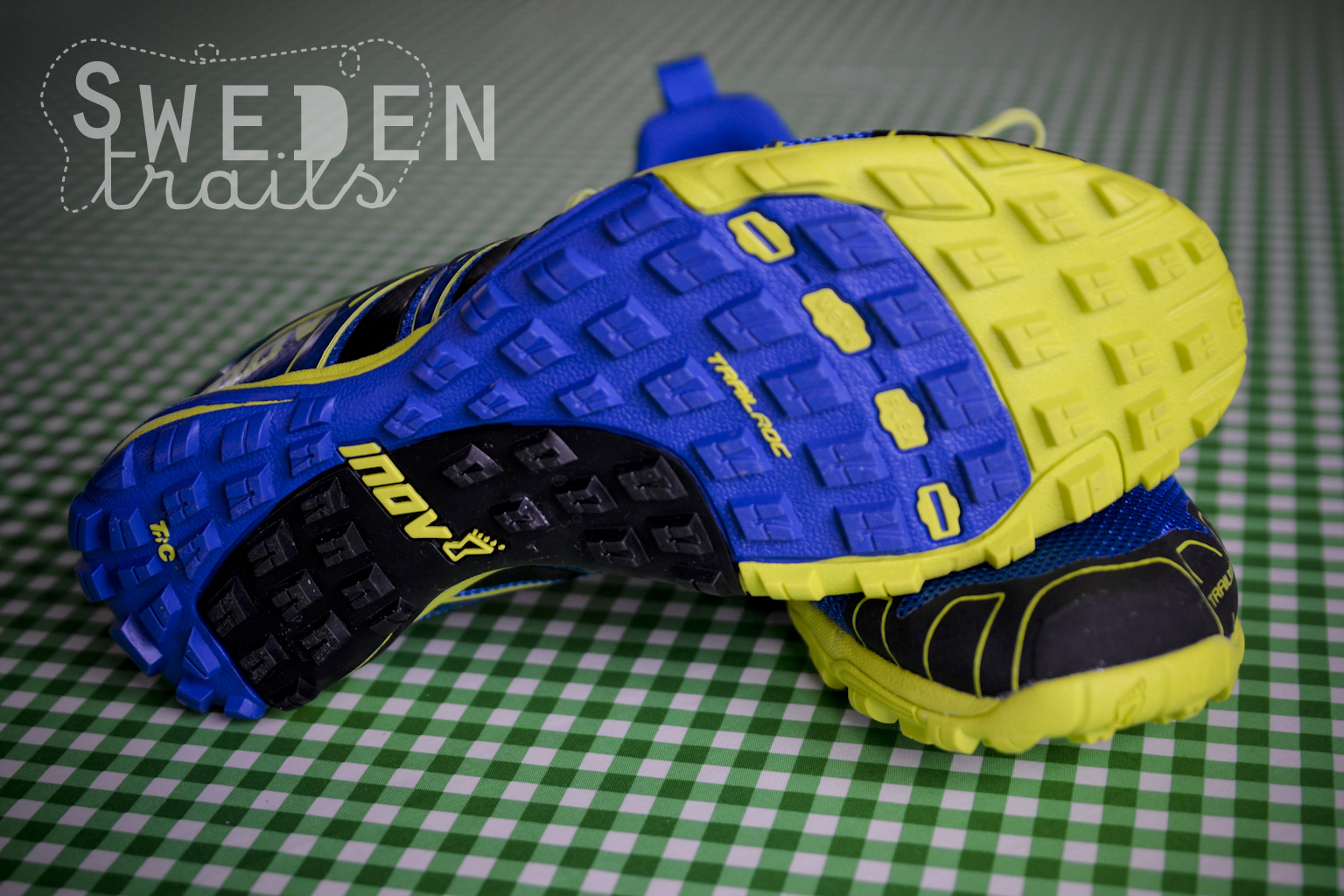 På hälen ser man tydligt markeringen med en pil som enligt Inov-8s Shock-zone system betyder 3mm drop från häl till tå. Hälkappan verkar högre än övriga lättviktsmodeller, kanske för att skon inte ska bli kvar i leran..